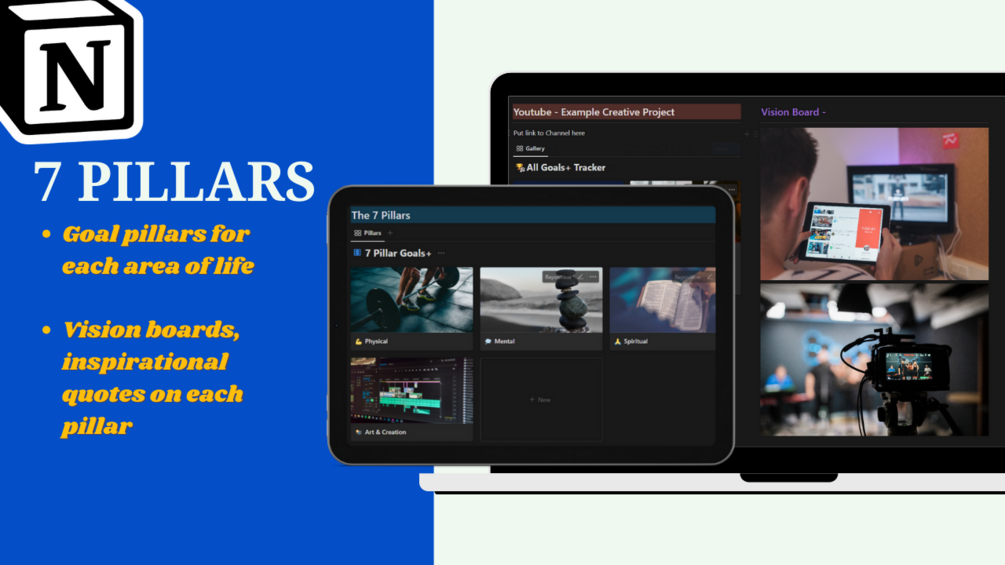 Each of these pillars has a specific theme page filled with 2 vision boards, 2 goal database views, and 2 spaces to note inspirational quotes or images that inspire you!